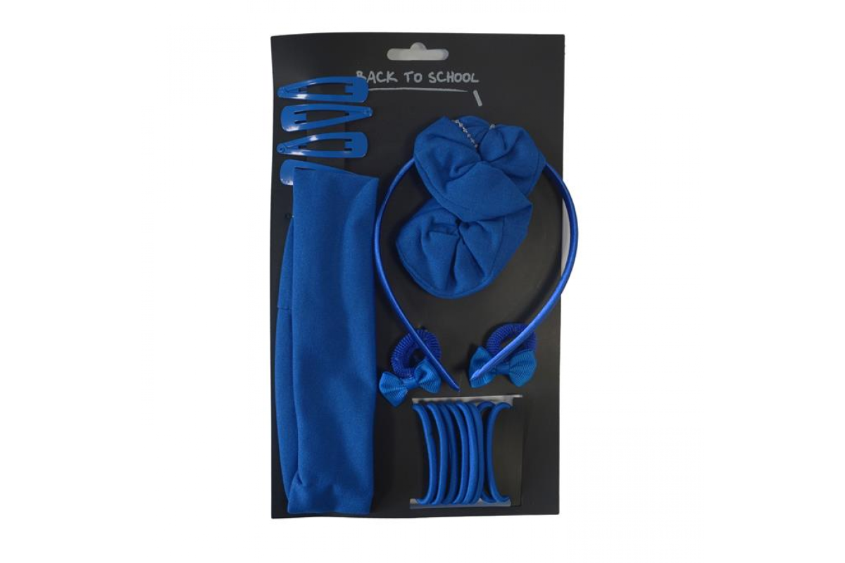 The perfect back to school set includes 4 x clips, jersey scrunchie, 2 x bow bobbles, ponios, 10mm alice band and jersey bandeaux.