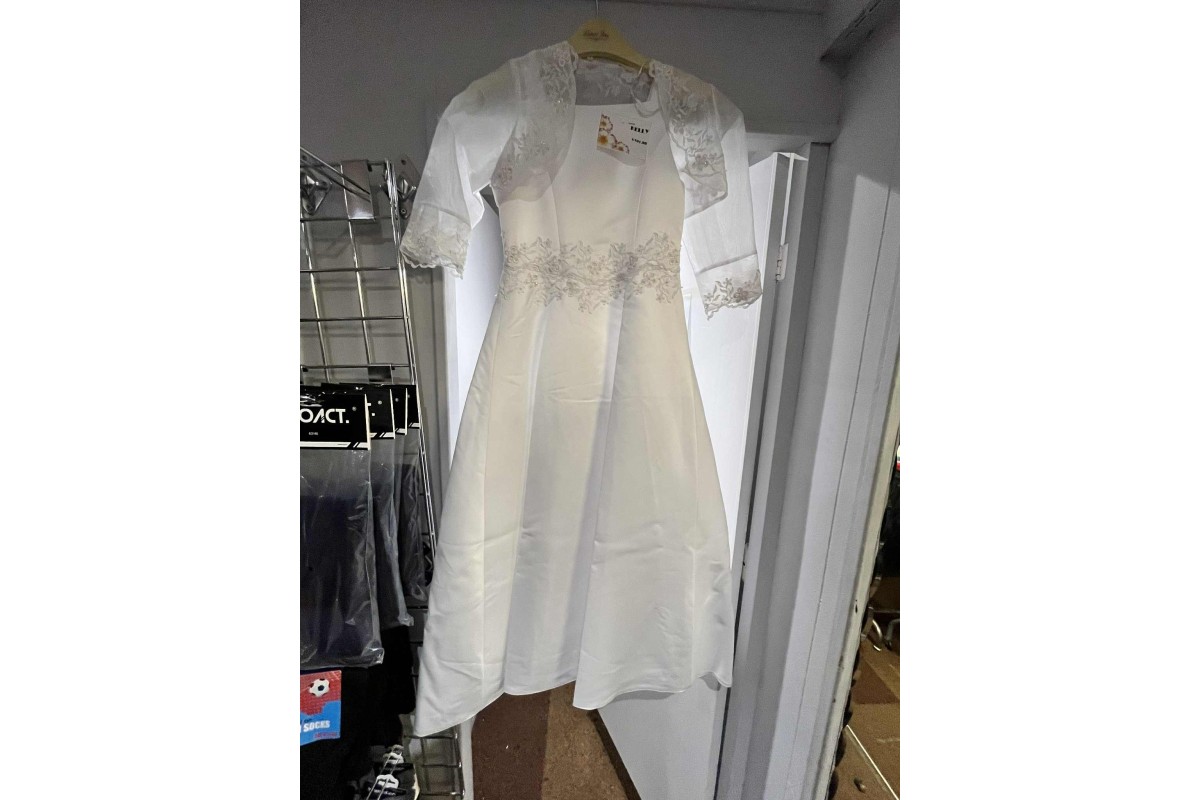 This beautiful dress by Linzi Jay can be used for a communion or a wedding. It has a lace and flower design along the waist and this design continues in a open v part of the skirt in the back and also has beading. This comes with a sheer bolero that has the same design on the sleeves which are 3 quarter length. This is a Linzi Jay size 8 which has a 26.5 inch chest,24.5 inch waist and a full length of 43 inches