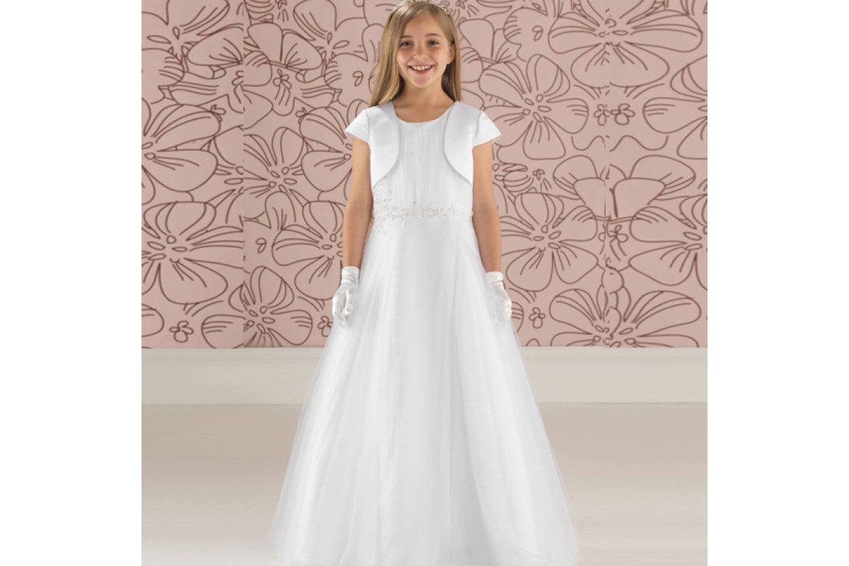 This Beautiful Dress by Linzi Jay can be used in a communion or a wedding, it has a solid white top with a intricate flower and leaf design with pearl like beads, the bottom has a sheer layer on top of the plain white skirt and this is broken up at the bottom to create a panel with a flower and pearl bead design, on the back there is a row of flowers which are in a satin like material. This also comes with a sheer bolero. This is a Linzi Jay size 12 which means it is a 30 inch chest and a 28 inch waist, it is also a full length of 49 inches.